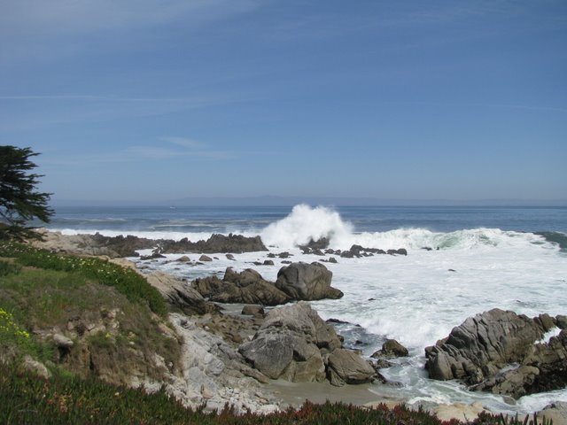 Soms kan het zo simpel zijn: op een bankje in de zon zitten en genieten van de golven over de rotsen uiteen spatten.