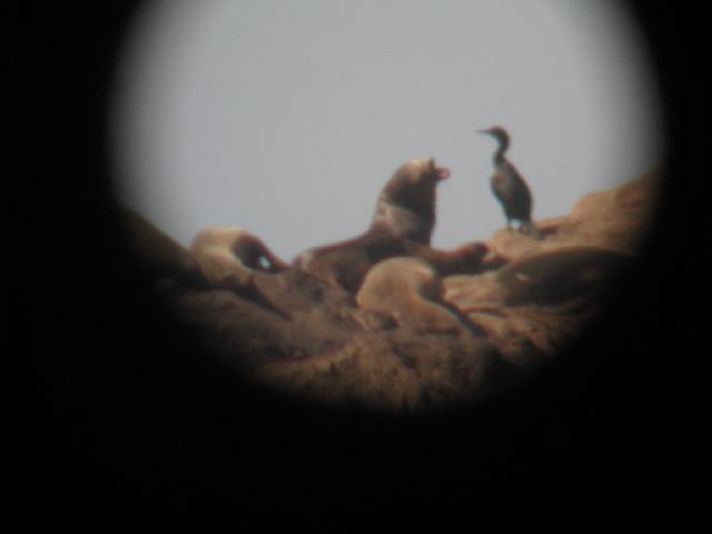 Volgens mij is deze zeeleeuw ietwat geirriteerd door de aalscholver die onverstoorbaar van het zonnetje staat te genieten.