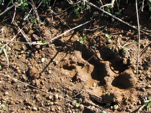 Tijdens onze wandeling speurde ik naar pootafdrukken van herten. Kwam ik ineens deze tegen van een katachtige. Die herken je aan het feit dat er geen nagelafdrukken te zien zijn. Honden kunnen hun nagels niet intrekken, bovendien mogen er geen honden in dit stuk wandelen. Ik denk niet dat de coyotes zich daar iets van aantrekken, maar dat terzijde.