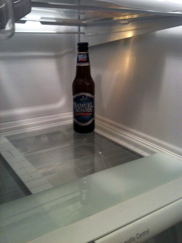 Toen ik vanmiddag de koelkast open deed stond deze eenzame jongen 'n beetje te verkleumen. Nu we zo vlak bij onze verhuizing zijn, is de koelkast redelijk leeg.