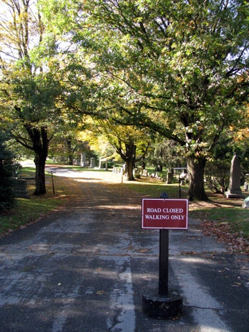 "Weg gesloten. Alleen wandelen" staat er op dit bordje. Ik kan me niet herinneren dat ik in Nederland weleens op een kerkhof ben geweest waar je met de auto rond mag rijden. In de VS is dat heel normaal. Nou was dit ook wel een groot kerkhof, maar ook bij ons om de hoek zie je mensen met de auto langs de grafstenen rijden. Soms komen ze voor hun bezoekje niet eens uit de auto, maar parkeren ze de auto voor de steen van bestemming en blijven lekker warm (of koel want airco) zitten.